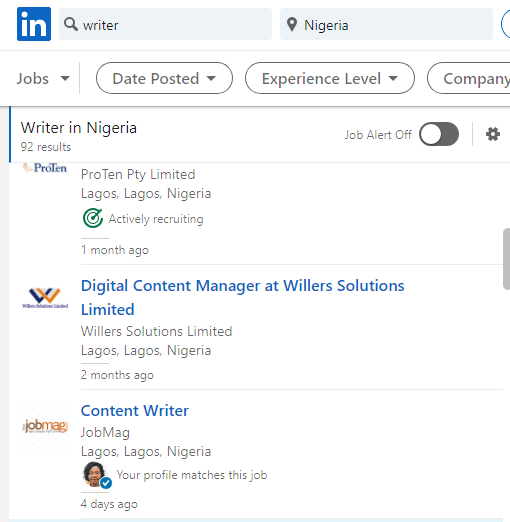 If you look at the picture below I put in “writer” as my job search. Among the job positions that came up, one is ticked us suitable for me.